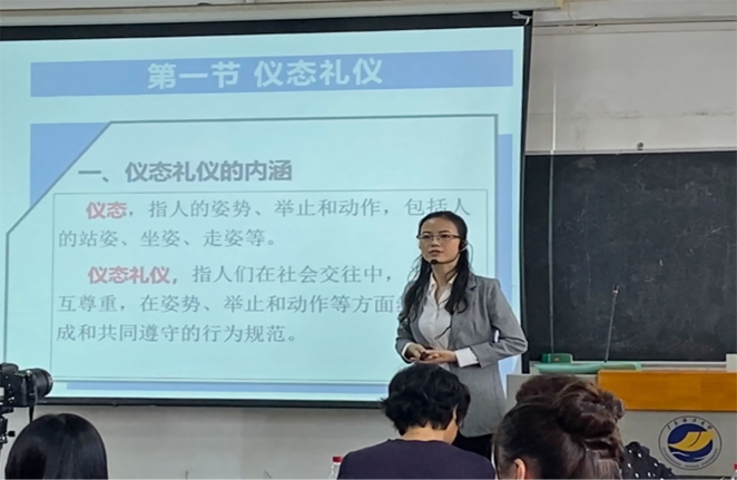 第一位参赛选手刘霞以《秘书社交礼仪》课程拉开了此次竞赛的序幕。她通过3个案例分析了仪态礼仪的内涵和要求,并邀请学生进行规范的站姿、坐姿、走姿和蹲姿示范。在授课过程中刘霞积极与学生互动,注意调动课堂气氛,教学目标达成度较高,得到了评委会的充分肯定。