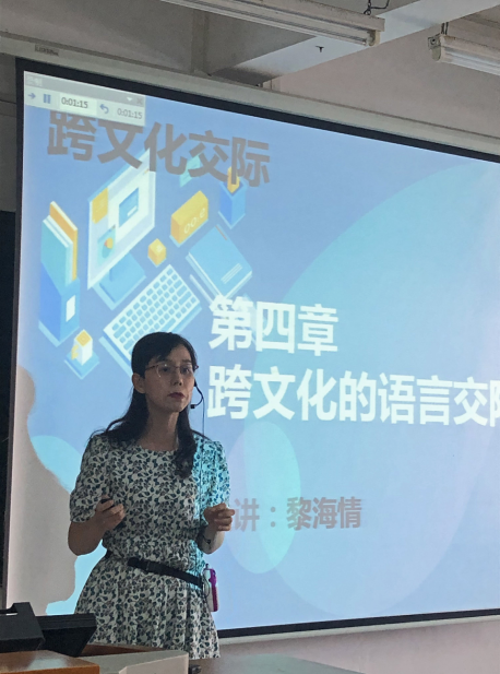 黎海情老师的《跨文化交际》课程,授课对象是2018级汉语国际教育专业的同学。她选择了跨文化交际中的语义差异为授课内容,以对外汉语教学中的一个真实而典型的案例导入,用生动形象、生活化和富有张力的语言,向同学们展示东西方语言文化的差异,师生互动活跃,课堂气氛热烈。