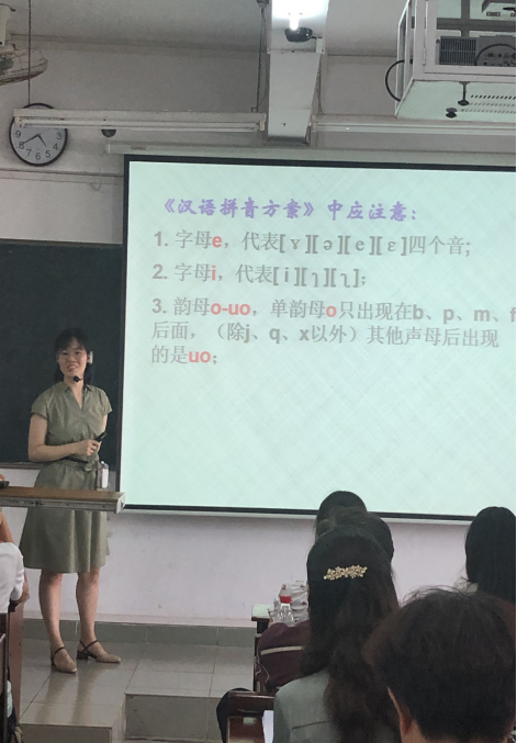安妮老师为2019级汉语国际教育专业的同学讲授《对外汉语教学法》中的语音教学章节。她用设计巧妙而精美的课件进行示范,以外国留学生发音偏误及改良为例分析,引导同学们精确掌握声母、韵母的发音方法,进而讲解其中的语音原理,讲授大方沉着,有条不紊,教学效果明显。