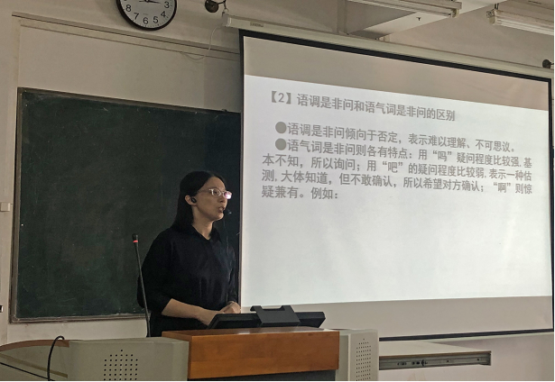 张伟、黎海情和安妮三位老师依次上台授课。张伟老师面向2020级汉语国际教育专业同学讲授《现代汉语》课程,选择的章节为《句类系统》。她主要对陈述句和疑问句进行教学展示,通过视频和丰富的例子引导学生理解句式中的重点难点,条理清晰、详略得当、言简意赅、深入浅出。