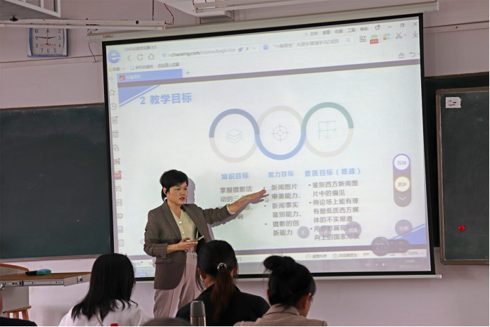 第一位参赛选手陈虹虹讲解的课程为《新闻摄影:摄影活动特性》,她在说课环节对该课程的内容结构、重难点、教学目标、教学方法及教学流程进行了清晰的梳理。在15分钟的讲课环节中,陈虹虹以小孔成像的知识原理为引入,结合布置课后思考、学习通小组讨论的教学方法,介绍了摄影的光学特性及摄影技术的局限性,并通过三组图片案例的对比分析,阐释说明了成像局限性带来的“技术迷思”,引导学生警惕“有图未必有真相”。她充分的授课准备、有条不紊的教学思路、对教学内容细致而系统化的专业呈现得到了评委会的一致肯定。