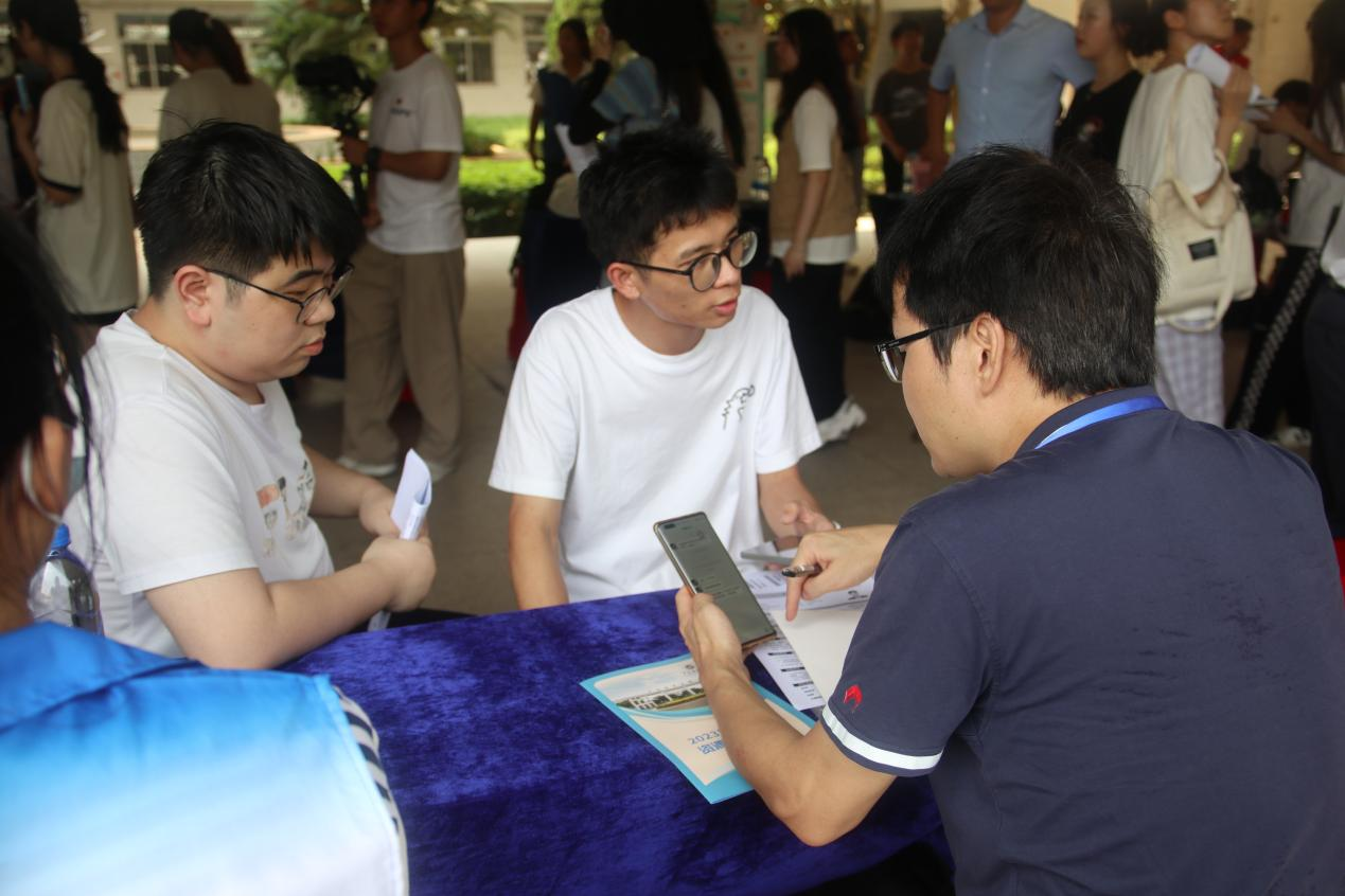 开幕式结束后,林晓敏率学院领导及辅导员老师一起走进招聘会现场,与企业代表和毕业生互动交流,详细了解各参会企业的人才需求和就业岗位信息等,亲切询问求职学生的就业意向和进展情况,并就目前就业市场形势下如何落实好就业工作对学院领导提出指导意见。招聘会现场气氛热闹,服务周到:有党员学生志愿者在“党员先锋岗”进行现场引导,有经验丰富的老师在“简历诊断专区”提供就业政策咨询和简历修改指导服务;企业代表们则在各自展位里向学生们耐心介绍情况,洽谈聘用事宜。