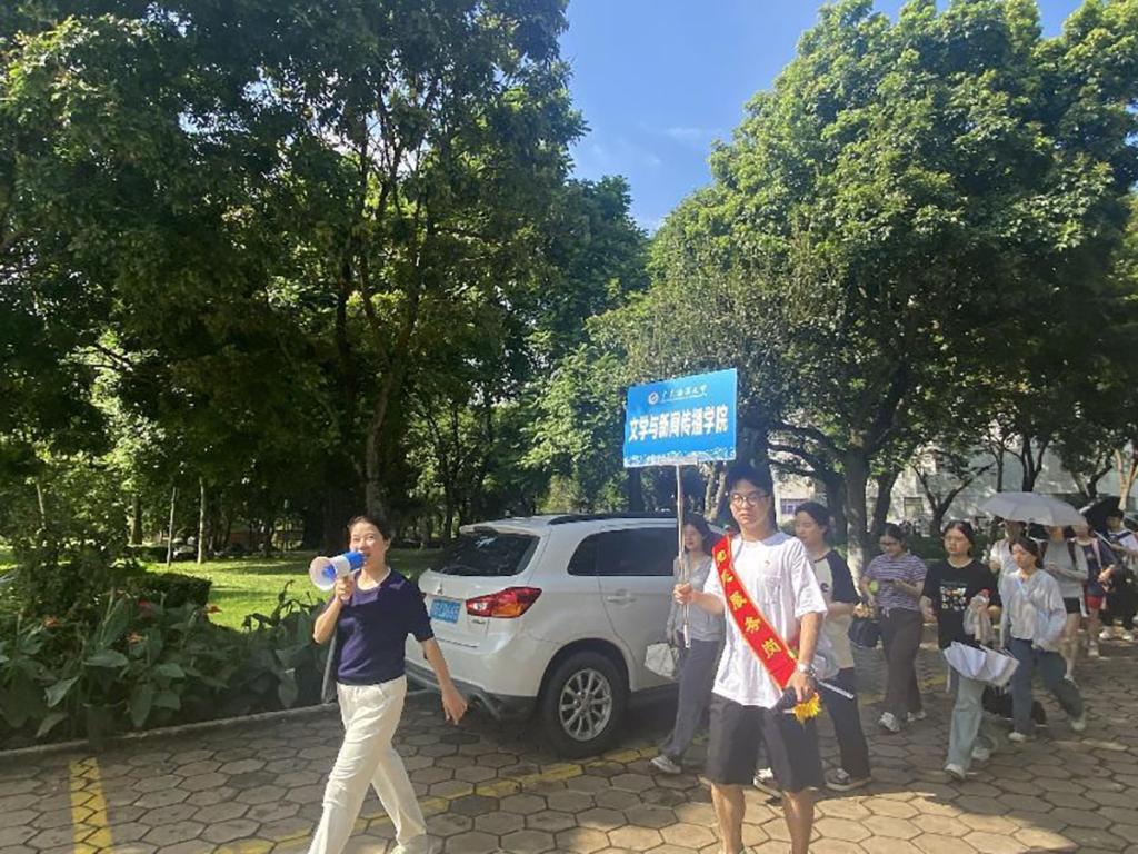 本次校园行的路线经过明德楼、钟海楼、广学楼、图书馆、中心广场、海洋广场等校园标志性建筑。在校园行的过程中,新同学们怀揣美好憧憬游览校园风光。辅导员和各班班助作为新生导游,介绍了主要校园建筑的外形特征和功能。崔文婷、林婉芳两位新生辅导员老师,在介绍学校基本情况的同时与新同学亲切互动。