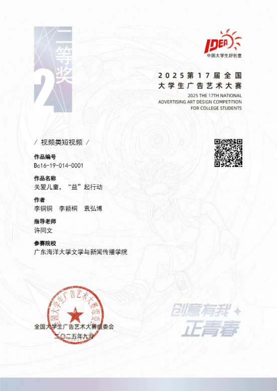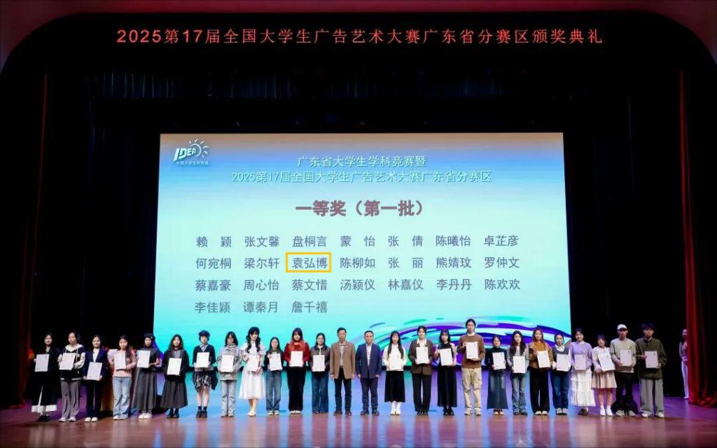 11月22日,第17届全国大学生广告艺术大赛(以下简称大广赛)广东赛区颁奖总结交流活动在广州商学院举行。文传学院共获一等奖1项、二等奖1项、三等奖2项。其中,李铜铜、李颖桐、袁弘博的作品《关爱儿童,“益”起行动》荣获省级一等奖、国家级二等奖。许同文老师被广东省教育厅评为“优秀指导教师”。
