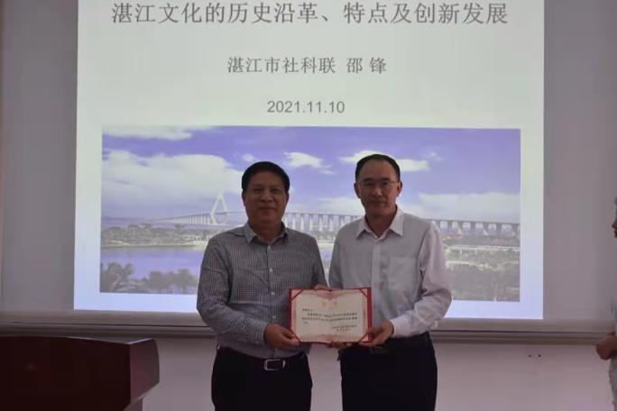 邵锋主席的学术报告梳理了湛江文化从上古至当代的历史进程,总结了湛江文化的内容种类、形态表现和地域特征,并就湛江文化的当代创新发展提出了具体建议。邵锋主席鼓励文传学院师生加强对湛江地方文化的研究和学习,为湛江市深化与粤港澳大湾区、海南自贸区(港)、北部湾的文化互动交流,融入“一带一路”和国内国外“双循环”,焕发新的文化生机和活力作出贡献。