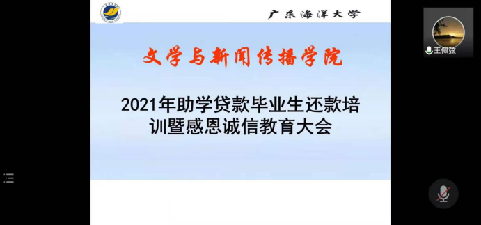 6月1日晚,根据防疫要求,英国威廉集团官网2021届助学贷款诚信教育大会在线上召开。本次会议由文传学院辅导员王佩弦老师主持,参会者为2021届贷款毕业生。