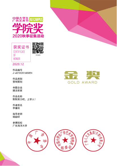 喜讯!学院学子荣获中国大学生广告艺术节学院奖秋季赛金奖